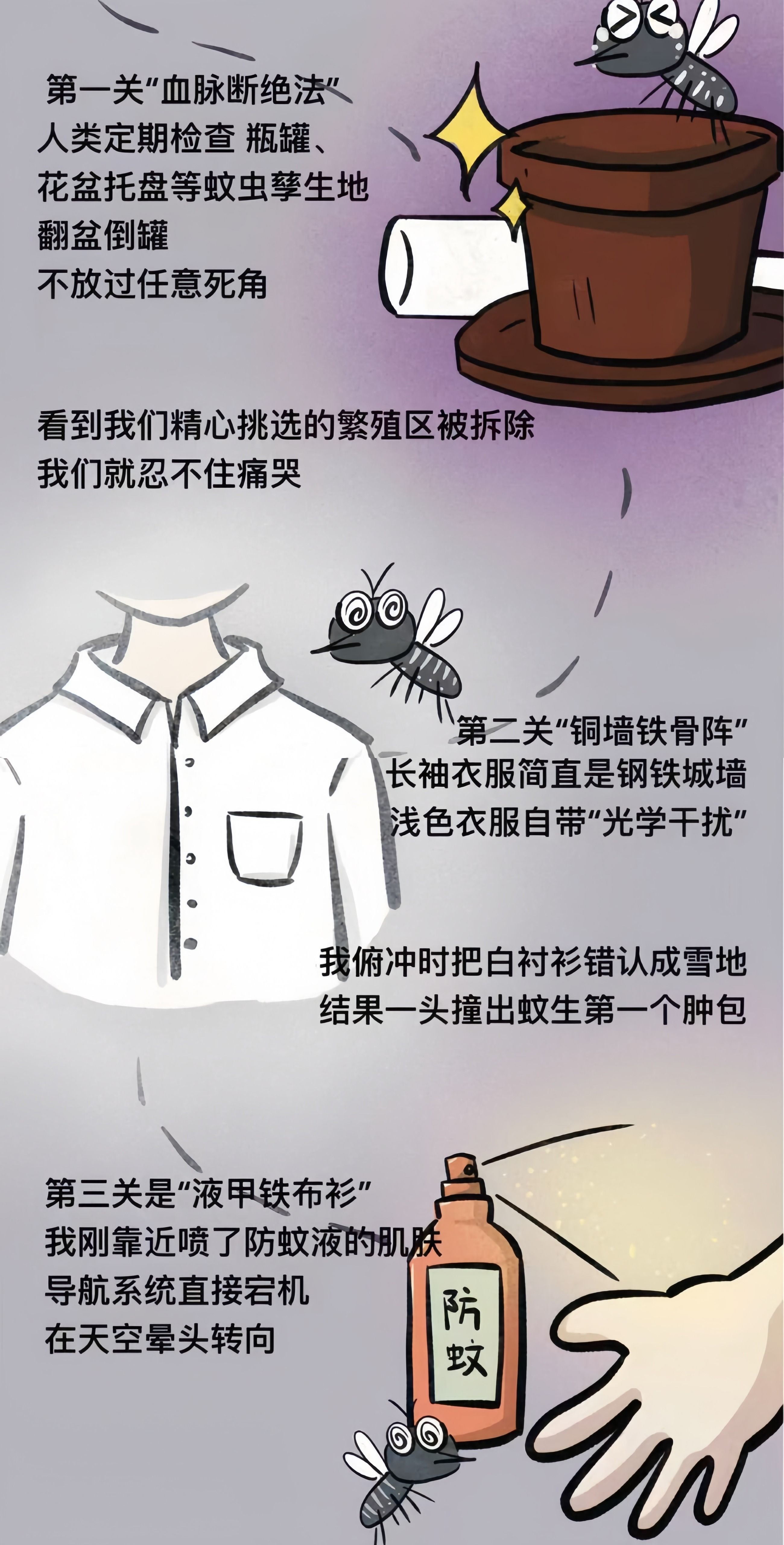 三是防叮咬。家居门窗争取安装纱门纱窗,防止蚊虫进入室内。睡觉时使用蚊帐,有效隔绝蚊虫。外出时穿长袖衣裤,或裸露皮肤喷涂有效驱蚊剂,减少暴露被叮咬风险。伊蚊活动高峰一般在日出后2小时以内和日落前2小时以内,外出活动时尽量避开蚊虫活动高峰期,尽量减少在户外草丛等蚊子多的地方停留时间。