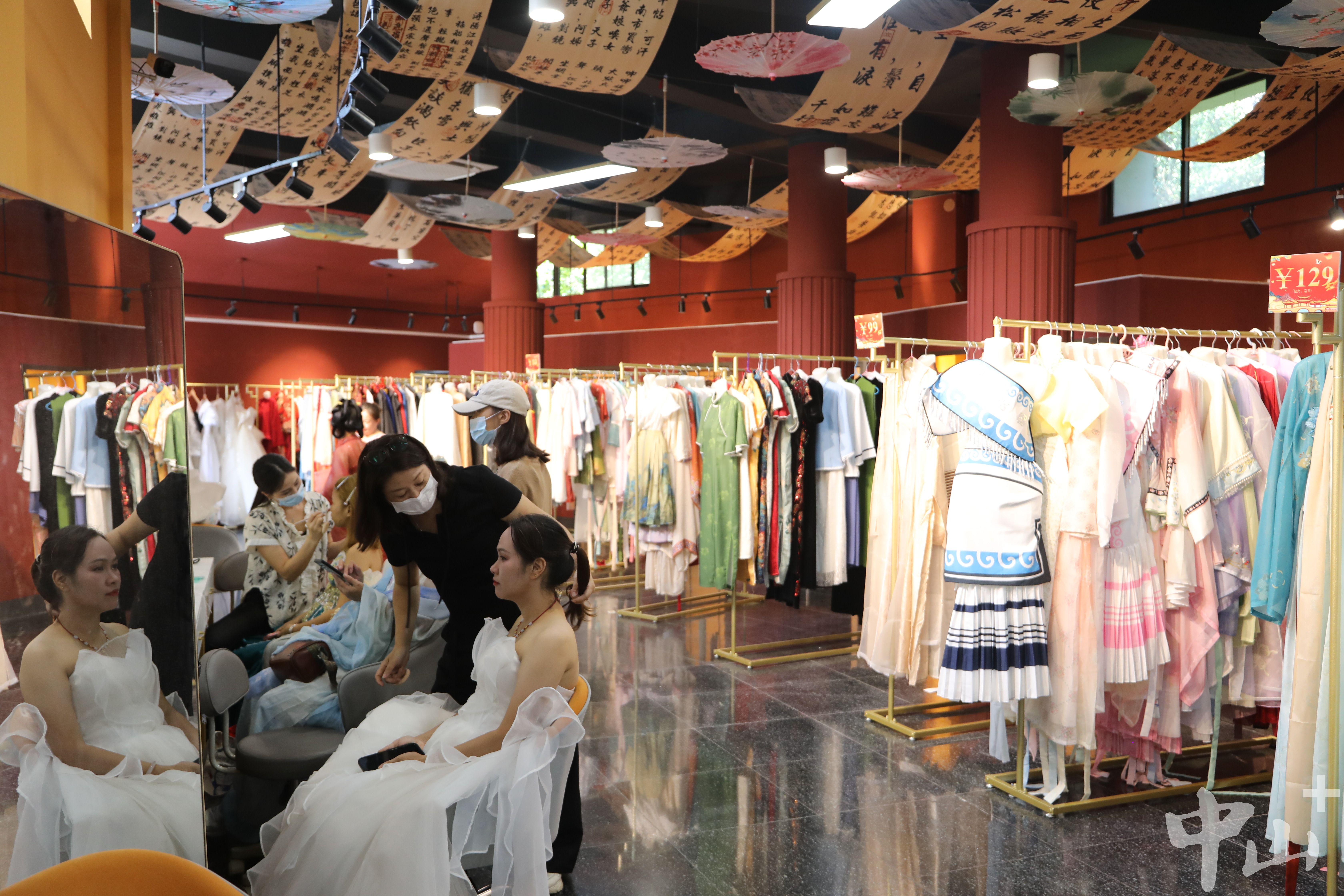 浓厚的影视氛围吸引游客纷纷来此玩“穿越”,中山影视城借此开办了中山故事换装体验馆,为游客提供一站式妆造、拍摄服务。假期游客体验热情高涨,排队换装化妆,一位化妆师感叹,“手不能停,一天得化20多位”。