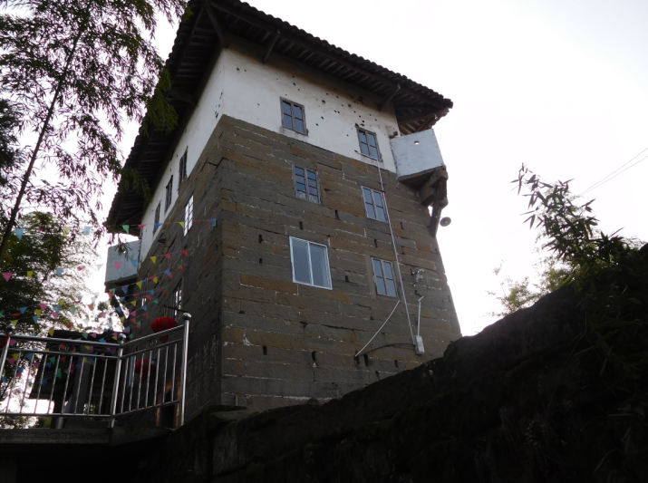 碉楼采用石木结构,青瓦屋面,本来不高,但与脚下大院比,却高耸入云。四壁坚固,墙体厚实,全由长一米、宽30x30厘米坚硬的大青条石砌成,坚不可摧,既不怕火攻,更能防御枪击。碉楼三面环山,前面依水,不怕洪涝。碉楼每层四角都建有突出悬挑的角堡,角堡内向前、向下设置枪孔炮眼,可以居高临下开枪。碉楼右下是近50间砖瓦房的四合院——姚家大院,这就是王家泰的生活起居地。大院与碉楼之间是一片陡峭的林荫。林荫里隐藏着98级石梯,由下而上直通碉楼。一旦有变,碉楼便是他龟守的宿营。这三重座建筑考究的石碉楼,见证了近百年沧桑的历史,记录着无数枪林弹雨、和血雨腥风的心酸史。