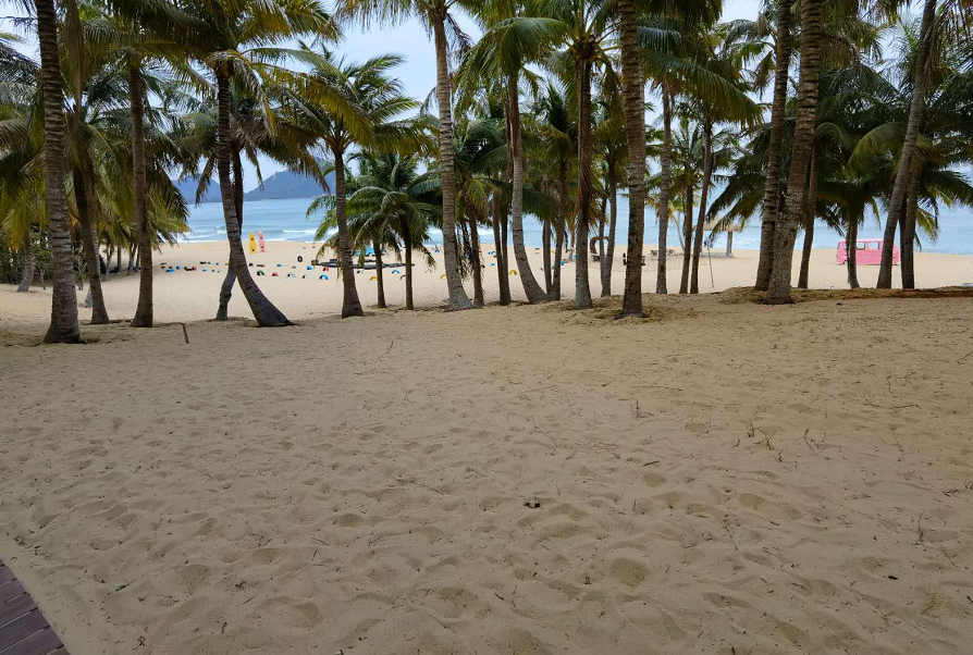 沿着木桩铺成的栈道一路走去,见不到熙熙攘攘的游客,也没有嘈杂混乱的声音,向我展现的,是这片海滩的安静与清宁;向我铺开的,是一幅色彩淡雅清丽的边海画卷。沙滩,就在我眼前向前延伸。栈道左边,是郁郁葱葱的防护林,右边,是疏落有致的椰林。椰林下面,星罗棋布点缀着茅屋、巴士、老爷车、秋千、老船……各式造型新颖的拍照道具,独具匠心,清新典雅,温馨浪漫。这种氛围,不知不觉捻动了我心弦,让我情不自禁走下栈道,融入天人合一的美好景致中。
