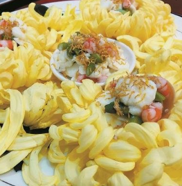菊花的栽培在许多国家都属稀少植物,惟独我国多有种菊的,且我国古代早都有作蔬食且售于市的记述。中山小榄种菊之盛,集中于每六十年一次的菊花会。期间,小榄人要制菊花肉、菊花菜肴和菊花点心。明朝的《岭南杂录》记载:小榄之菊花饼,中含菊花,尤为美味。菊花肉丸风味亦殊不俗,非他处所可比拟者也。当然,我国吃菊不仅盛于小榄,珠江三角洲,即广州、佛山、南海、顺德等地都普遍地种植可供吃花瓣的菊花。小榄和上述各地,均善用菊花作高贵的配料,做成一道道宴会上色、香、味均臻上乘的菊花名菜。2020年小榄菊花会上,笔者有幸一品丰盛的菊花宴,菜品包括“菊花鱼头羹”、、“菊花椒盐明虾” 、“菊花咕噜肉”、“菊花炸鱼球”、“菊花咖喱金菇肥牛卷”、“腊肉蒸菊饼”、“菊花蚬肉生菜包“”、“菊花绿豆让莲藕”、“菊花柚皮焖鳝”、“菊花八宝糯米饭”、“油炸菊香条”等,饮品则有菊花酒、菊花茶。由它们搭配而成的筵席称为“菊花宴”,传至海外,特别销至港、澳而传誉。其中的“菊花炸鲮球”是一道风味独特的家乡菊菜,厨艺大师麦广帆厨师说,这道菜起源于明代小榄山,是一群自北南下的难民传授下来的,到1979年的菊花会,此菜更是名噪海外。菊花炸鲮球之所以有特色,除以菊花为菜食外,又因中山所产鲮鱼,尤为肥美。笔者有幸在小榄菊花会期间品尝了菊花宴,而且获得了菊花炸鲮球的祖传制法:以鲮鱼1斤净肉,配入生粉2两,水面,腊肉粒(或肥肉粒)1两,另蒜茸、陈皮、盐糖、味精、胡切粉、花生油适量。把洗净的鲮鱼肉,以毛巾裹着抓干,用刀剁,放盐,搅拌至起胶;又放入生粉、开水,再搅拌,放入配料,以顺同一方向,由慢至快地搅拌,然后挤成球状,入油镬炸之。炸否导金黄色,便可上碟。碟边再以食用菊花生菜丝铺成图案装饰。合用时,还可佐料配蚬蚧汁,其味益加香甜独特。