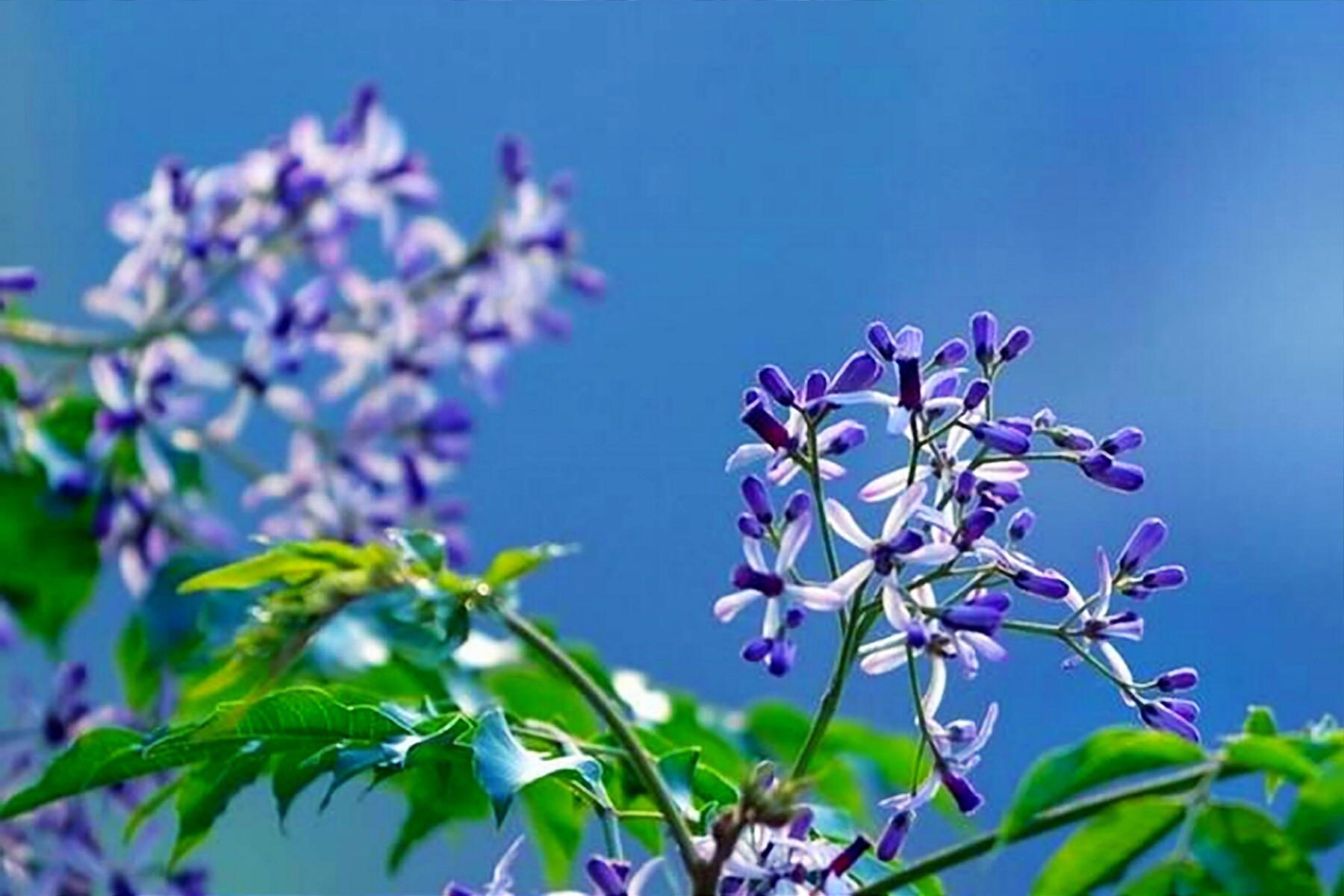 楝花绽到极盛之时,一嘟噜一嘟噜的,仿佛团团紫云悠然飘下。微风骤起,花儿伴着绿叶翩翩起舞,散发出阵阵醉人的芳菲。若夜间有风雨袭来,地上则落满一层楝花,好一片香气缭绕。难怪席慕蓉这样写楝花:“你几乎不能相信,一棵苦楝能够开得这样疯狂,而同时又是这般温柔。”