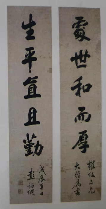雄鸡唱晓,五星红旗飘扬神州大地之时,文事得以复兴,伍权枝装裱之艺又有用武之地,叙文斋重新开业,那副“处世和而厚,生平直且勤”对联再次挂于店内。尤其是改革开放以后,真正迎来了装裱业的春天,那副彭炳纲的墨宝更是成了镇店之宝,传家之宝,慕其大名的人时来观赏这副联句,很多人竟将“处世和而厚,生平直且勤”当做自己的人生座右铭,请名家书写,激励自己,也激励自己的儿女。