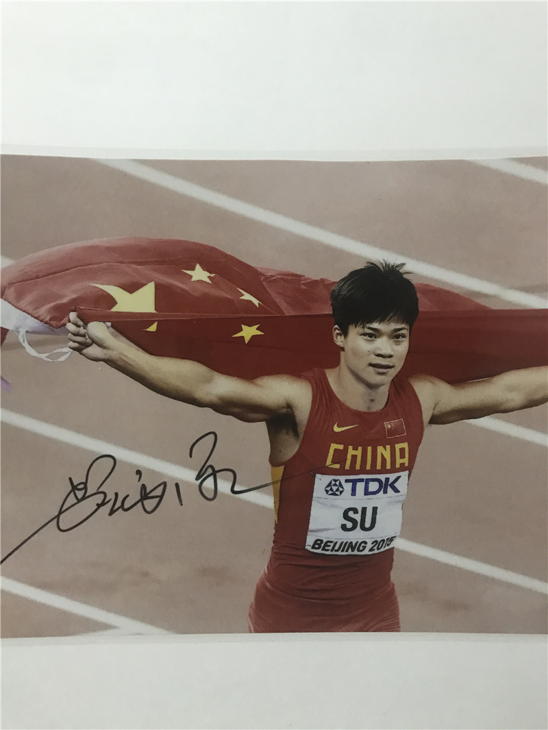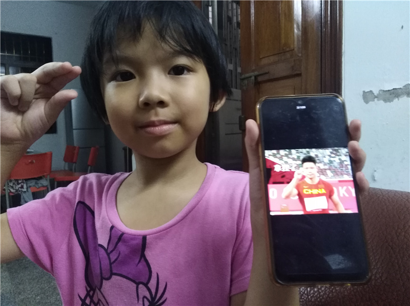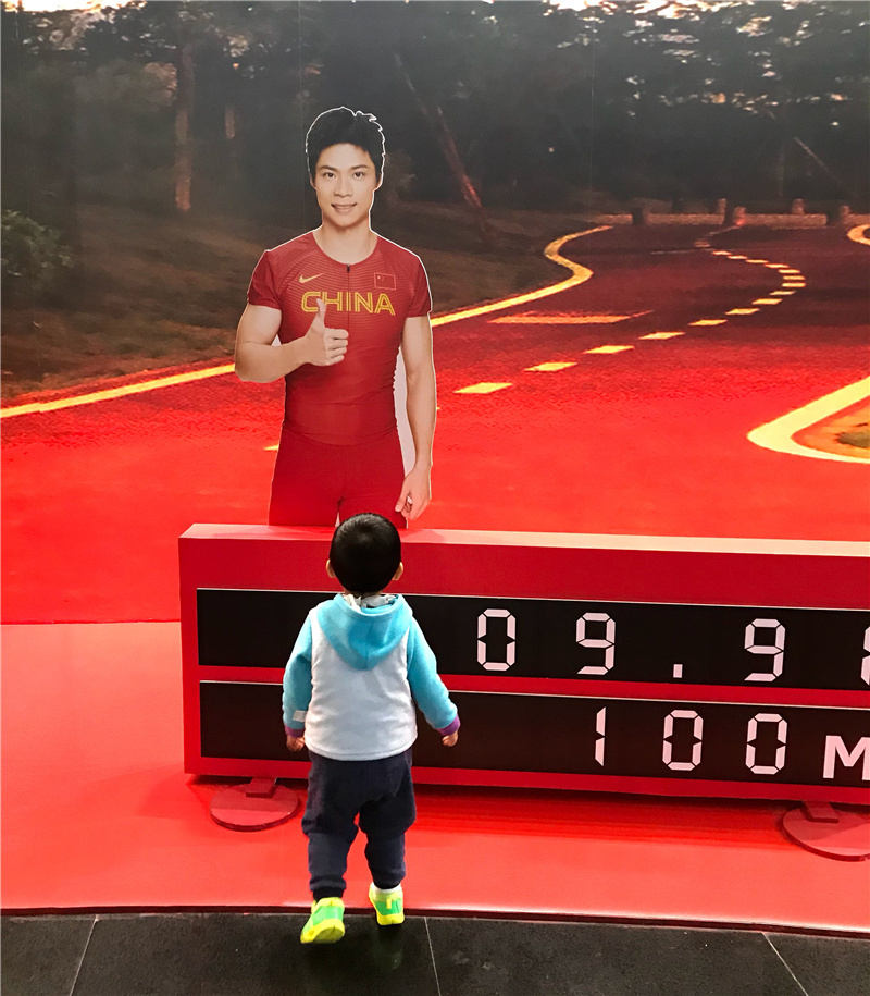▲杨杨:妈妈告诉我,苏叔叔是亚洲100米飞人,懵懂的我仰望着苏神帅气的人像,妈妈抓拍了下来,于是就有了第一张合影。现在苏叔叔跑这么快,我要为苏叔叔加油。