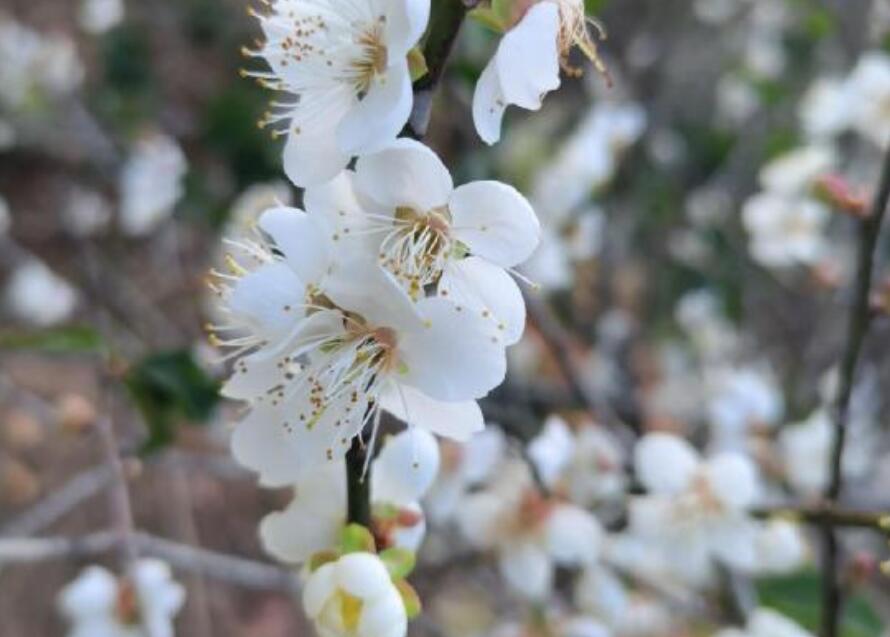 近日天气回暖,这几天正是梅开的全盛期。银装素裹的梅树上,朵朵梅花荡开嫣然的笑脸,水嫩鲜润,玉琢瓷砌,粉嘟嘟,白艳艳。抬头望,蓝天青山衬托下,朵朵白色的精灵仿佛正要朝你怀里扑下来,再送你一个香吻;俯首处,片片花瓣随风洒下,似纷纷扬扬的雪花飘向大地;吸气时,阵阵幽香沁入肺腑,瞬间让人神清气爽;凝神听,嗡嗡蜂鸣,啁啁鸟吟……