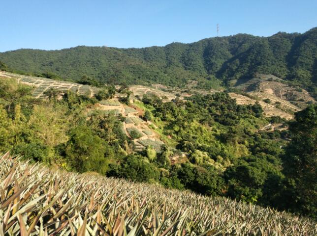 放眼,低洼,山腰,种满了菠萝,层层叠叠,错落有致,像梯田,又像油画。
