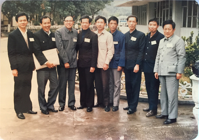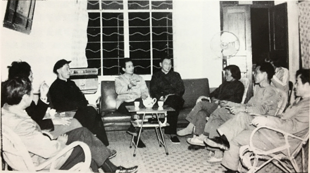 当年余松岩(左三)与中山县委宣传部长陈占勤一起采访中山靠劳动致富的第一位万元户孙浩广。