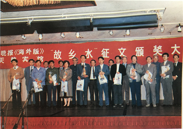 1987年,第一次“故乡水”征文比赛获奖者与评委合影。一排左四为余松岩。
