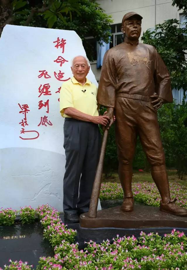 2015年梁扶初雕像在东升高中落成,梁友文与父亲雕像合影。