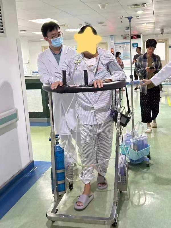 几经周折,患者于8月24日从ICU转入心胸外科普通病房,康复治疗也继续进行。“在转科当天,我们与驻扎在心胸外科的治疗师进行病情沟通,让患者继续进行康复治疗,不会因为转科而有所耽搁。”梁莉莉说,在病房,治疗师主要给患者进行呼吸排痰训练、心肺运动训练改善患者的运动能力。在治疗师的鼓励与引导下,患者很快能推着助行车走路。此时患者身上仍然穿着5条引流管,接着4个水封瓶。随着患者意识的进一步清醒和病情的好转,他身上的尿管、胃管、引流管也慢慢开始拔除。9月6日,患者已经不需要任何辅助自己步行了。9月12日,患者身上最后一根引流管拔除。9月16日,患者康复出院。