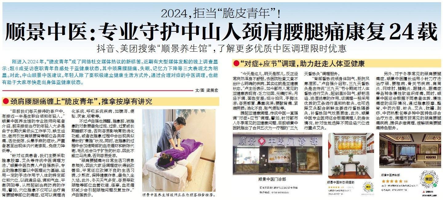 刚进入2024年,“脆皮青年”成了网络社交媒体热议的新标签。近期有大型媒体发起的线上调查显示:超6成受访在职青年自感处于亚健康状态,其中颈肩腰腿痛、失眠、记忆力下降等三大表现尤为明显。对此,中山顺景中医建议,年轻人除了要积极建立健康生活方式外,通过合理对症的中医调理,也能有助于大家尽快走出身体亚健康状态。