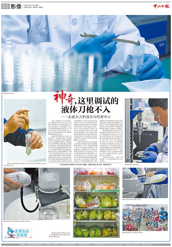 市场上销售的产品,外观相似,用户体验有可能完全不同,背后是材料和结构设计等方面的差异。记者近日走进位于石岐街道的广东太力科技集团股份有限公司(以下简称“太力科技”)的太力创新中心,了解企业在纳米流体等高分子新材料领域的成果及其应用。