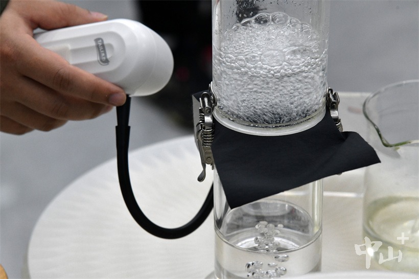 ▲透气不漏水材料测试。该材料可让气体通过,但隔绝水分进入。