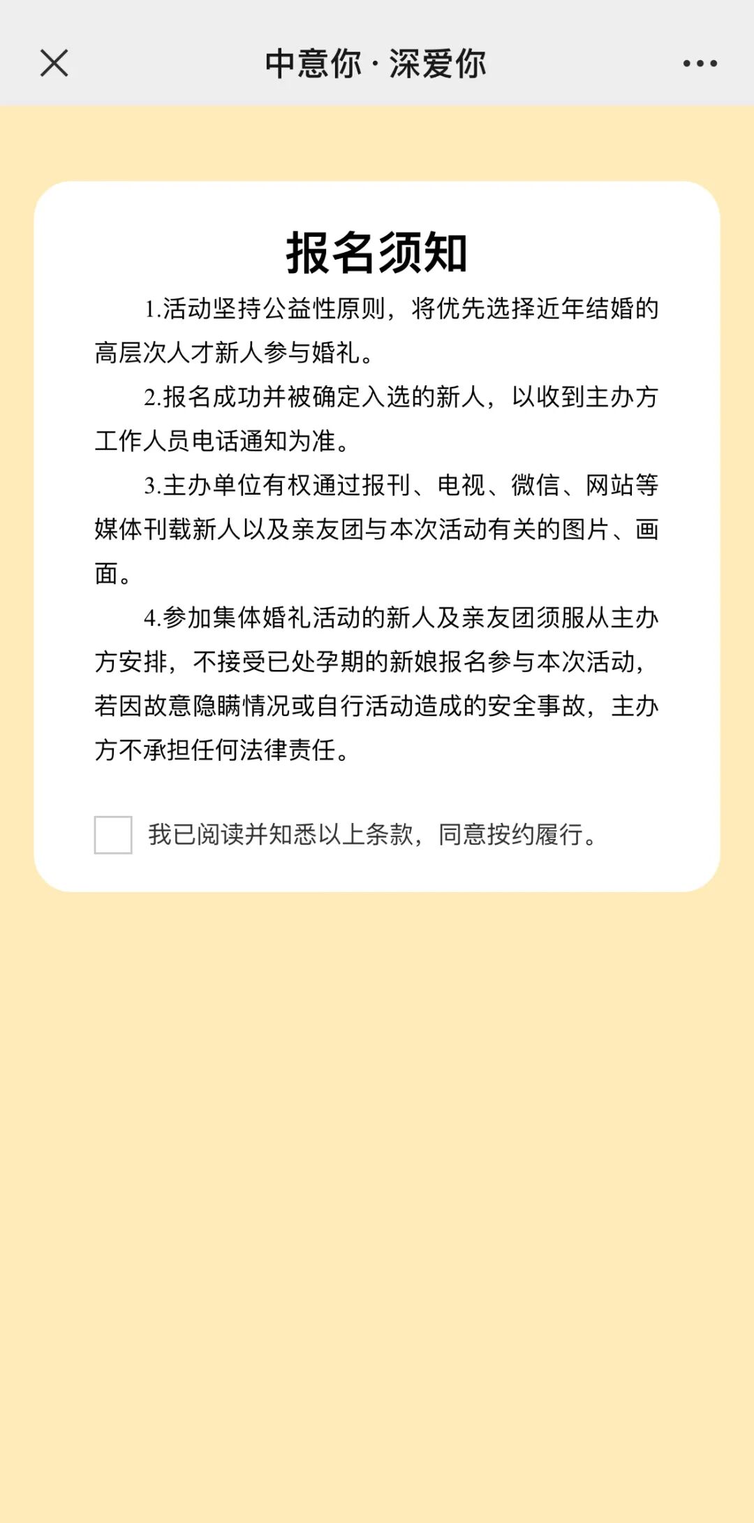 ③自愿参加集体婚礼,并得到单位和家人的同意,按时全程参加有关活动(前期视频拍摄、婚礼彩排、婚礼当天仪式),服从主办方安排,不得无故推迟、放弃婚礼等相关活动的。