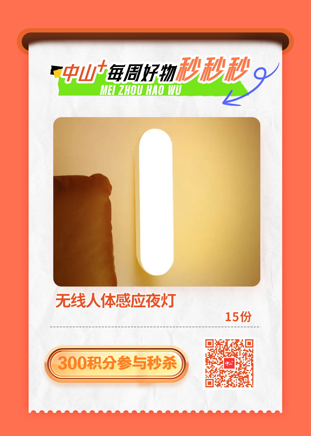 2024年4月17日上午10时,中山+用户前往中山+积分商城,即可用300积分限时秒杀,本周共送出15份无线人体感应夜灯,兑完即止。