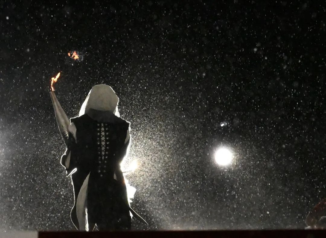 当地时间7月26日,一名演员手持火炬在开幕式现场表演。新华社记者 李安 摄