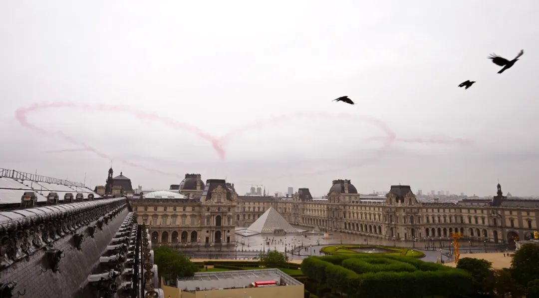 当地时间7月26日在开幕式上拍摄的巴黎圣母院上空的心形烟雾。新华社记者 夏一方 摄