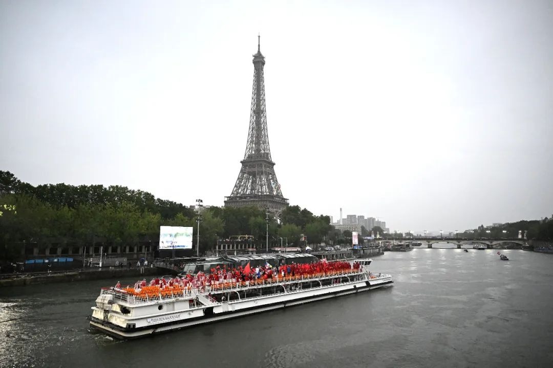 当地时间7月26日,中国体育代表团乘坐的船只行驶在塞纳河上,远处是埃菲尔铁塔。新华社记者 李安 摄