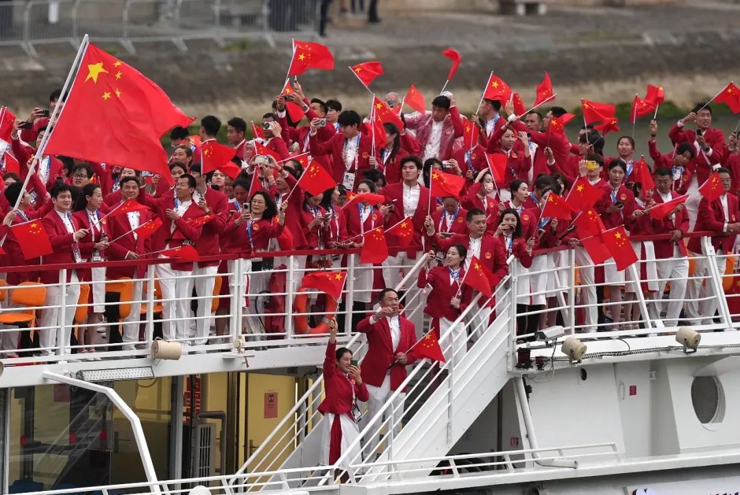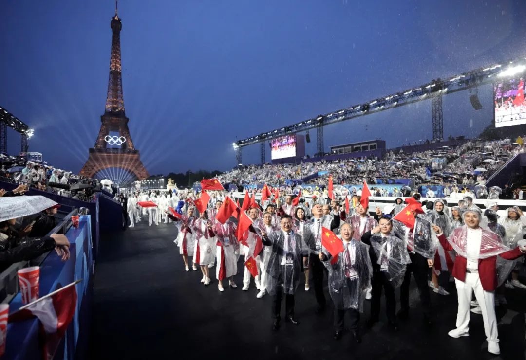 当地时间7月26日,中国体育代表团成员在开幕式现场。新华社记者 王毓国 摄