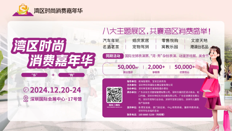2024年12月20-24日,以“深享盛惠,全民乐购”为主题的湾区时尚消费嘉年华将在深圳国际会展中心17号馆隆重举行。本次展会由深圳市招华国际会展运营有限公司主办,深圳报业集团宝安日报社等单位承办,深圳市宝安区福海街道办协办。嘉年华计划展出面积5万平方米,精心规划了8大消费主题,涵盖30余个展出品类。