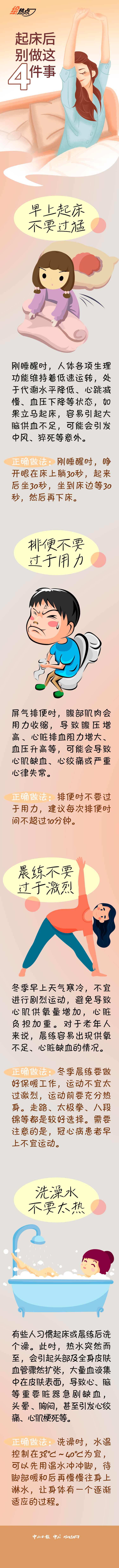 冬季昼夜温差大,冷暖变化易诱发心脑血管等疾病,尤其刚起床时,心肌处于相对缺血状态,血液也相对黏稠。早上起床后要注意什么?这4件事不建议做↓↓