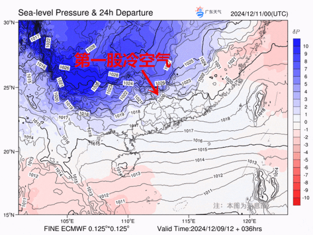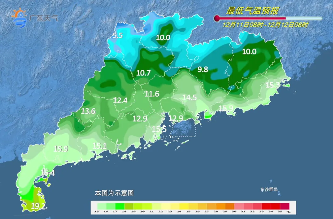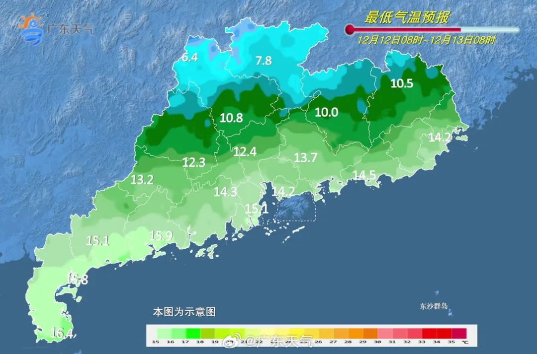 降温幅度:气温逐日下降,过程降幅介于5~8℃,预计过程最低出现在15-16日早晨,粤北和珠三角北部有大范围5℃及以下低温,高海拔山区1~3℃,天气晴冷,需注意添衣加被。