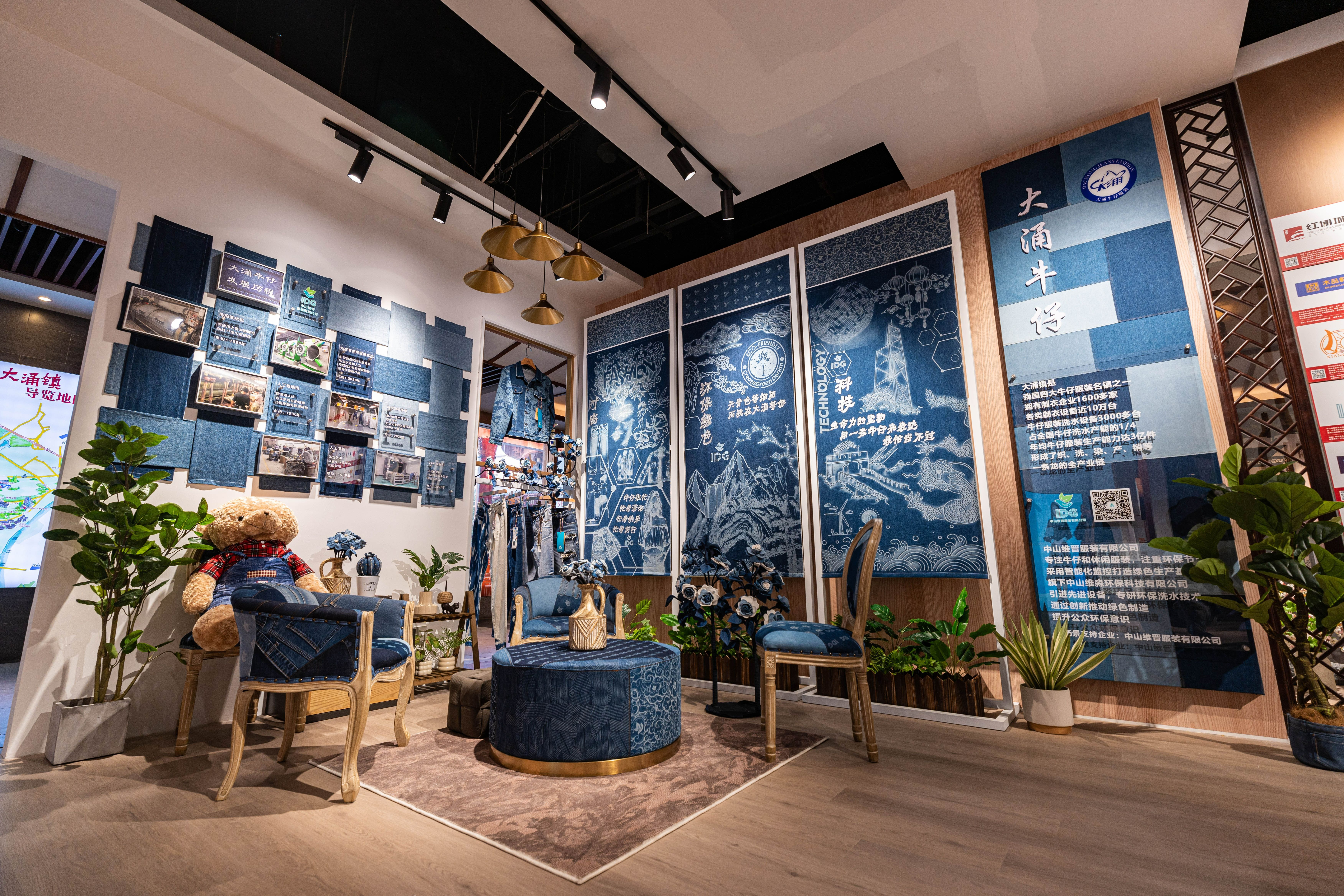 时光印记·发展长廊,通过七个篇章、118张图片、近万文字,全景式展现大涌镇发展情况;大涌红木体验区,通过红木家具、榫卯部件、木匠工具等场景设计,向群众展示了中国传统家具的优越材质、精湛工艺、丰富内涵;大涌牛仔体验区,打造产业文化的沉浸式体验空间,巧妙展示大涌牛仔产业的发展历程和最新的生产技术,展现时尚、绿色环保、科技的传统产业新形象;美丽庭院体验区,贯彻绿美中山建设理念,打造美丽庭院体验场景,生动诠释“自己家园自己建自己管自己美”的理念。客厅内还设有大涌镇特色工艺品销售专柜,展出具有代表性的大涌文创作品、红木雕刻精品。同时,展出大涌学生巧妙利用牛仔碎布“变废为宝”的艺术作品,全方位展现大涌镇独特的地域文化、深厚的产业文化魅力。