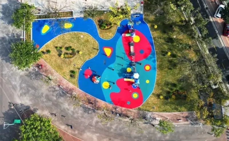 小公园里绿意盎然,高大乔木和低矮灌木错落有致,阳光草坪上点缀着各式妍丽的花卉,可谓一步一景。儿童游乐区则从原来的冷色调变为暖色调,大面积弧形元素设计和彩色地面的加入,提升了区域阳光、动感、活力的感觉,为体育公园A区增添了一抹亮色。