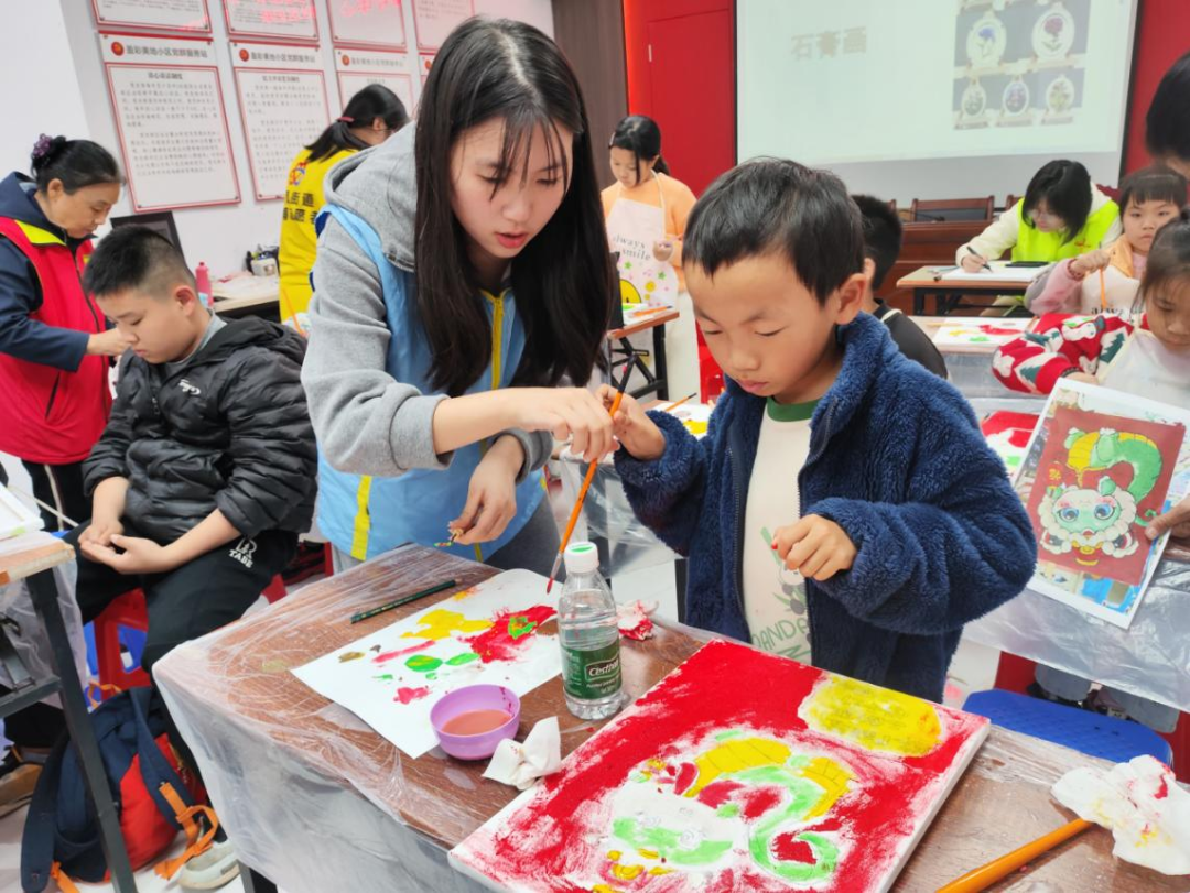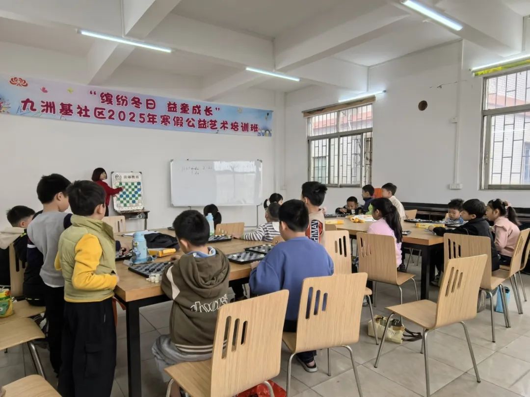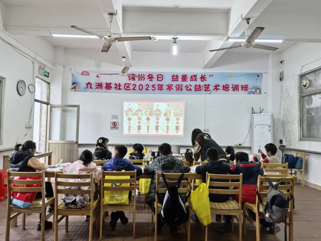 小榄镇九洲基社区举办“缤纷冬日 益童成长”寒假公益培训班,涵盖创意美术、硬笔书法、烙画、跳棋、古筝、葫芦丝、田径、篮球等多个课程,吸引了约250名学生参与。