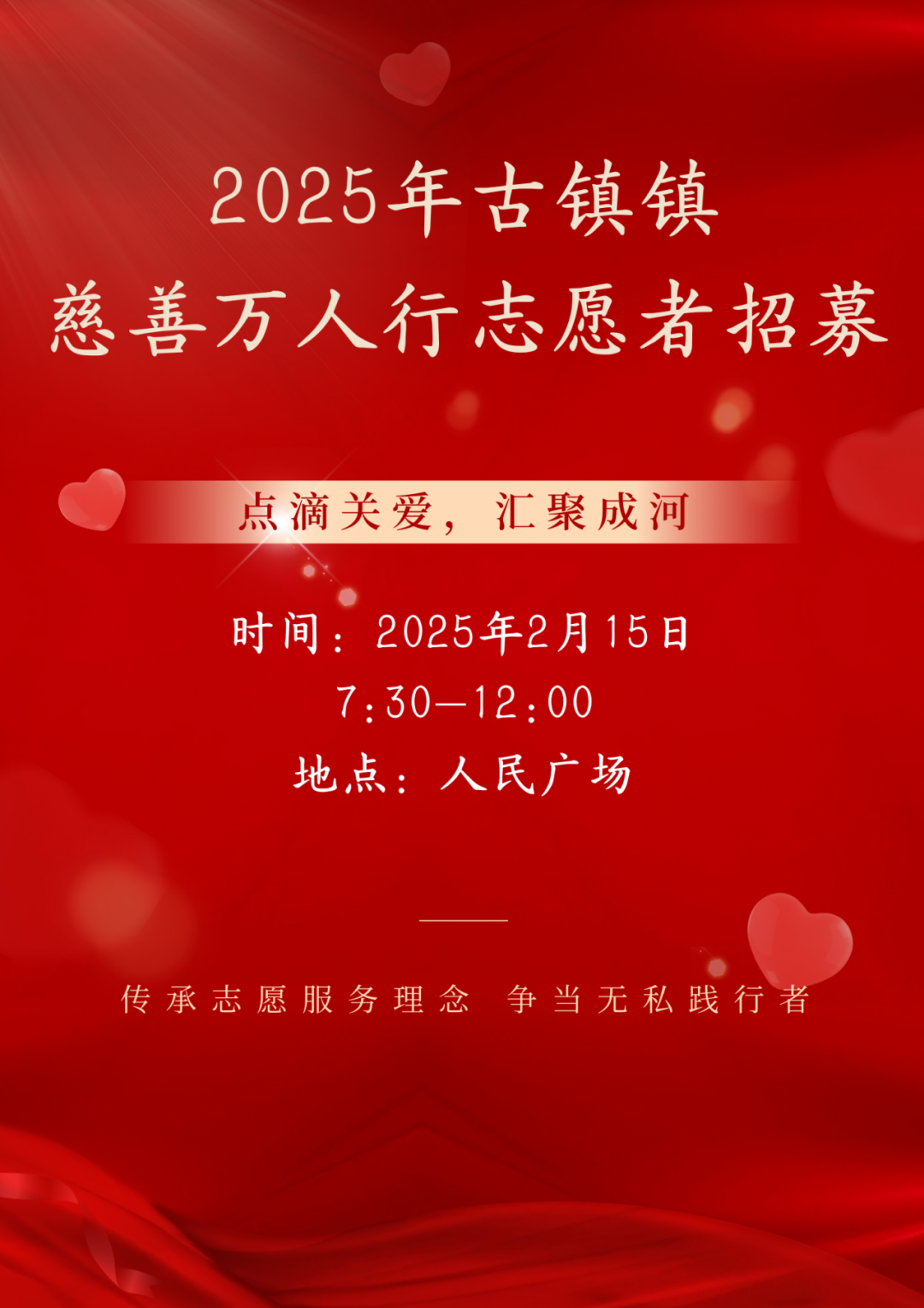 为弘扬人道博爱奉献精神,凝聚爱心公益力量,2025年古镇镇慈善万人行于2月15日上午正式举行。为助力慈善万人行的顺利进行,保障队伍行进和现场秩序,古镇镇团委现招募慈善万人行志愿者,为现场奉献一份“热”!