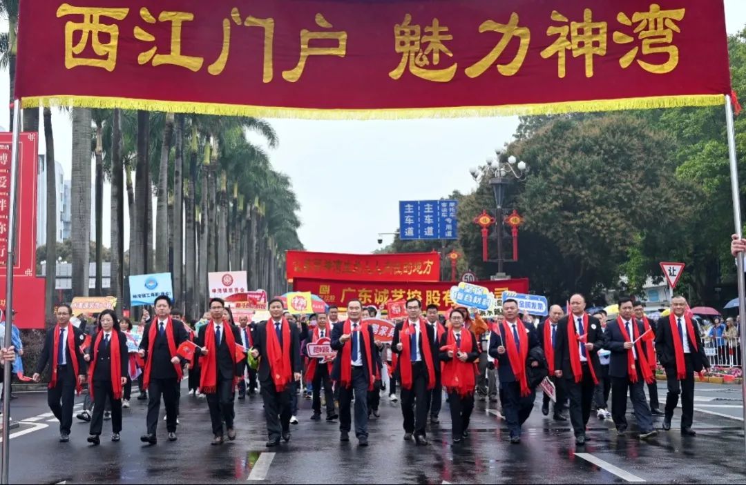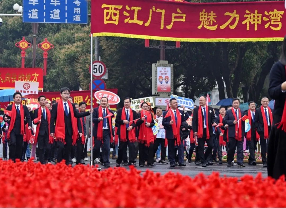 巡游中,方阵成员高喊“西江门户、魅力神湾;环湾绿岛、滨水新城”响亮口号,不时向驻足道路两旁的市民挥旗致意、热情互动,以昂扬向上的姿态展现神湾崇德向善、奋发有为的精神风貌,以及在高质量发展之路上勇立潮头的决心。
