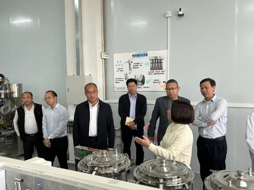 郭明星一行首先参观了药业公司现代化生产车间、研发实验室,详细了解中药饮片加工、配方颗粒生产、健康食品研发等核心环节。据企业负责人介绍,公司在中药材行业深耕40余年,已发展成为集中药材种植、中药饮片生产、研发,中药材、中药饮片、药食同源的食品销售全产业链于一体的大型中药集团企业,拥有GMP认证生产线和多项专利技术,产品辐射粤港澳大湾区及海外市场。