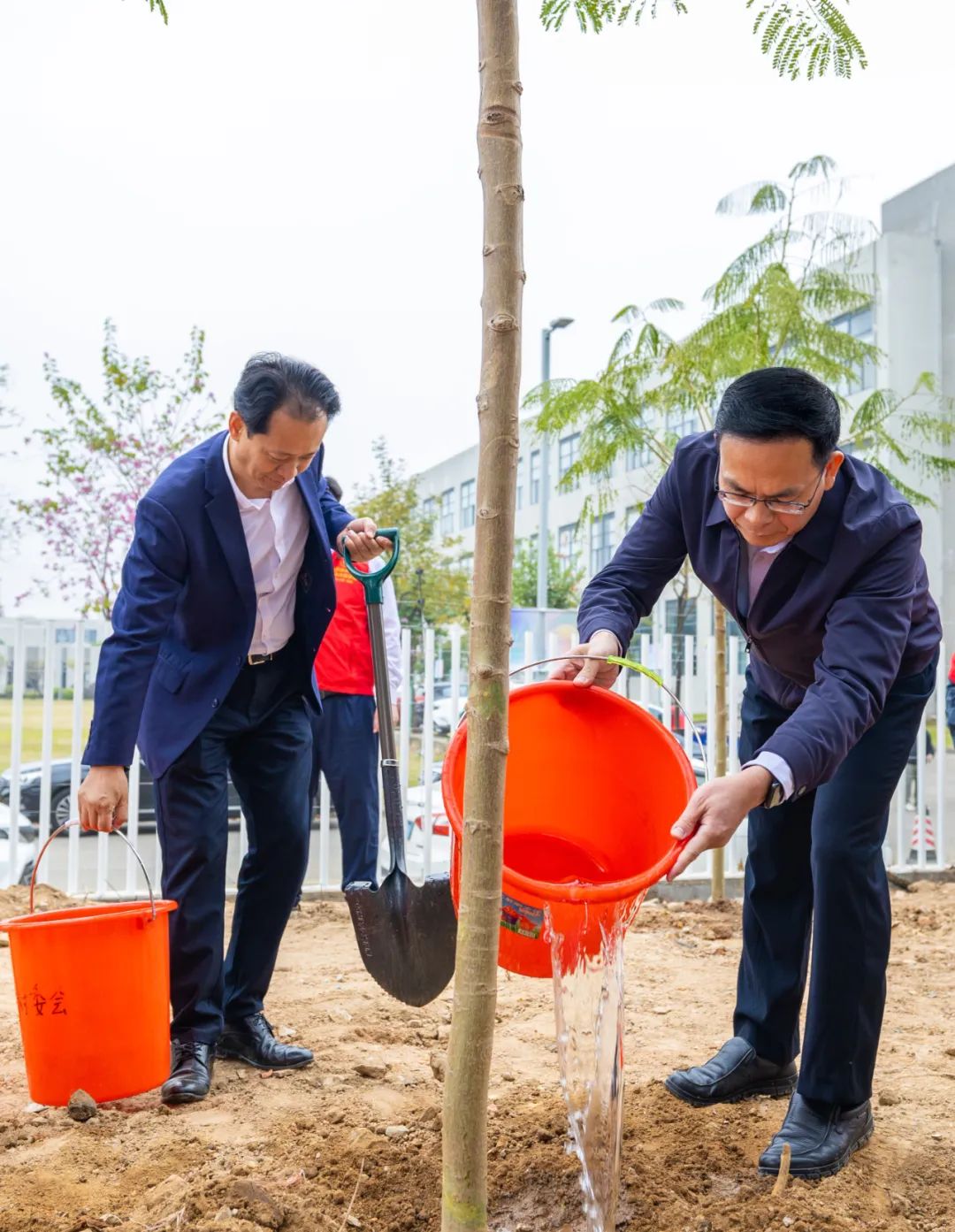 植树过程中,大家默契配合,有的负责挖坑铲土,为树苗扎根做好准备;有的负责提苗扶正,确保树苗能够笔直站立……在大家的共同努力下,共栽下秋枫、沉香、凤凰木等100多株,一个崭新的“创青林”焕发勃勃生机。