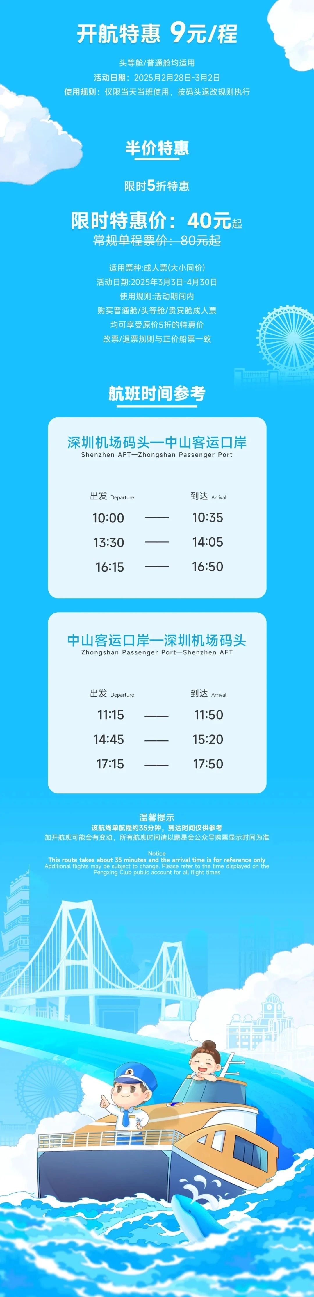 “在航线开通初期,我们将分两个阶段实施票价优惠。”中港客运联营有限公司相关负责人表示,2月28日至3月2日为开航特惠期,票价低至9元/程,头等舱、普通舱均适用;3月3日至4月30日为半价特惠期,限时特惠价为40元起,市民购买普通舱、头等舱、贵宾舱成人票(大小同价)均可享受原价5折的特惠价。