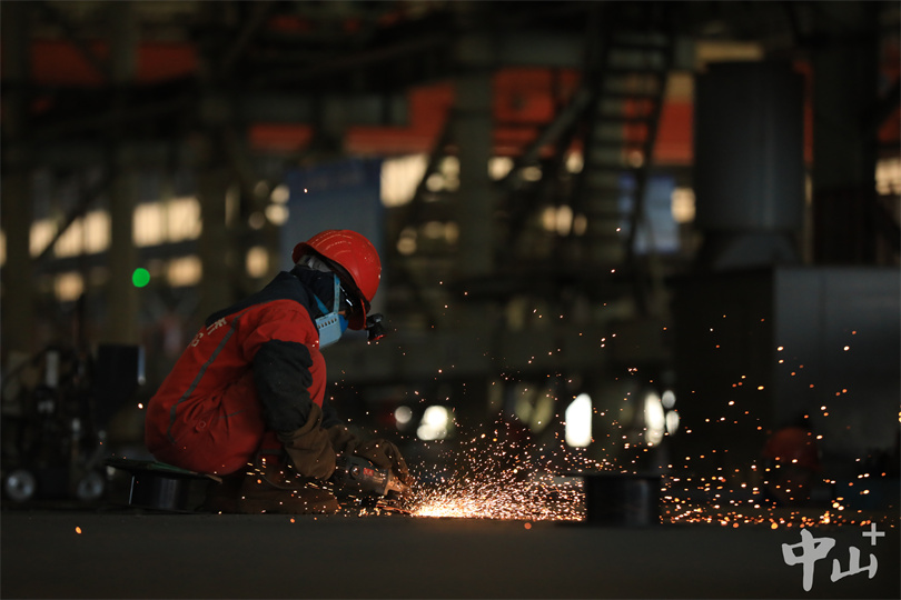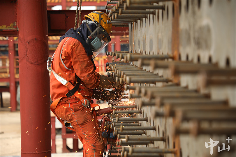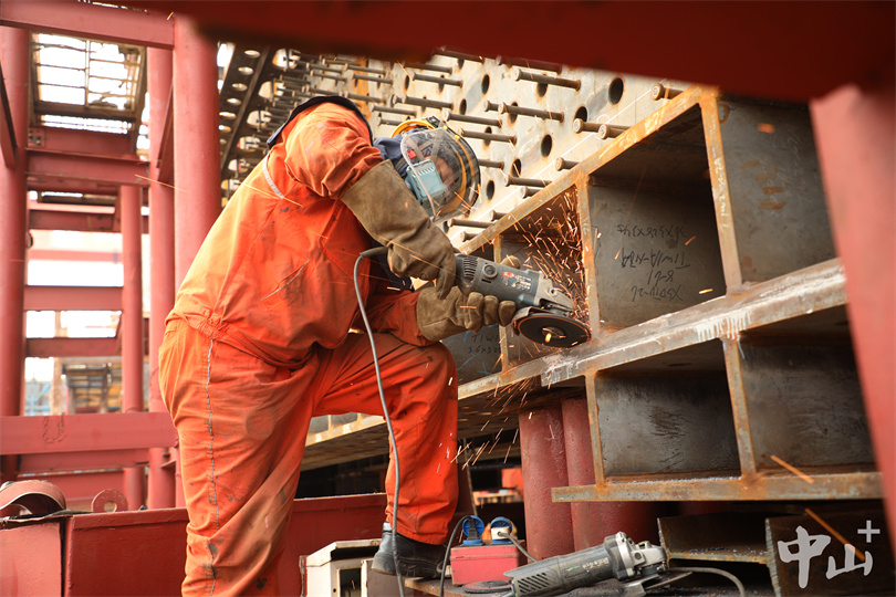 ▲工人对建设中的厦门三通道钢壳塔进行打磨。