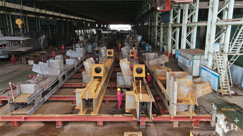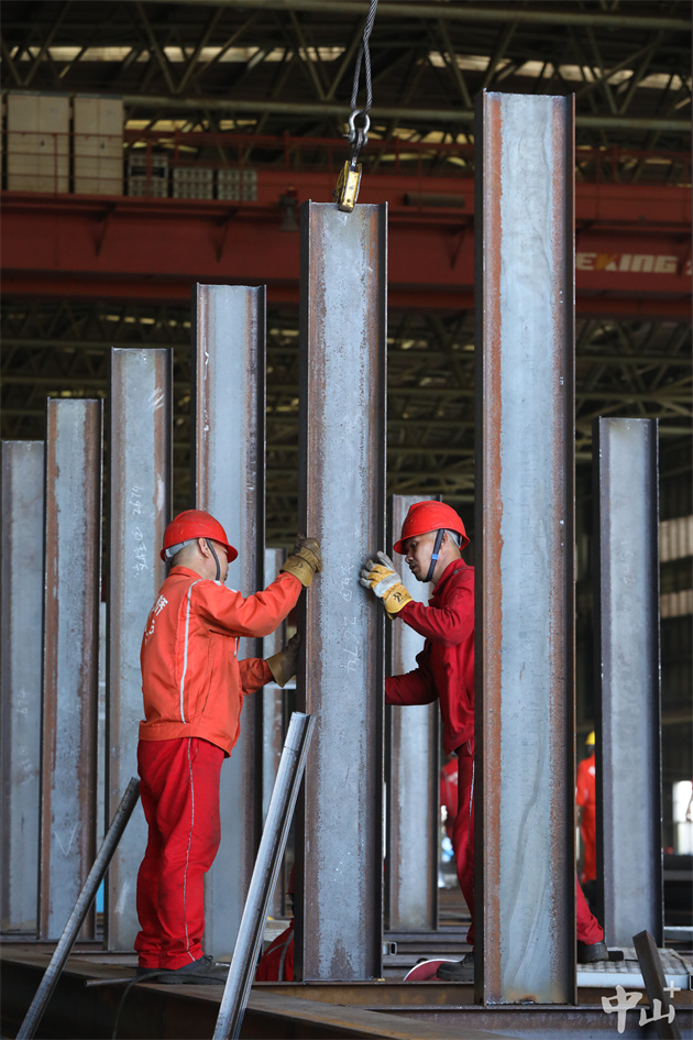 ▲工人们分工协作,进行洪奇沥大桥杆件制作。
