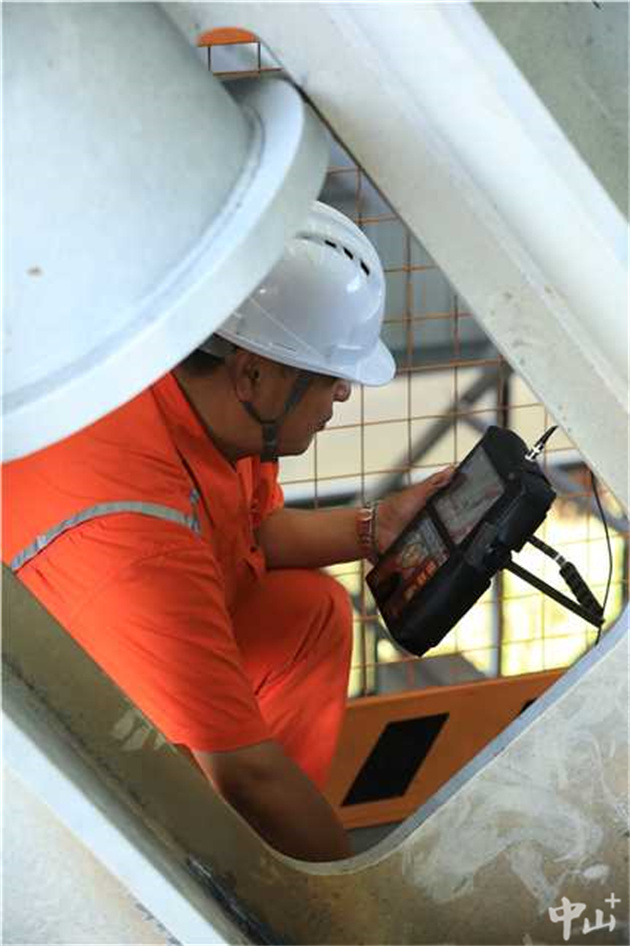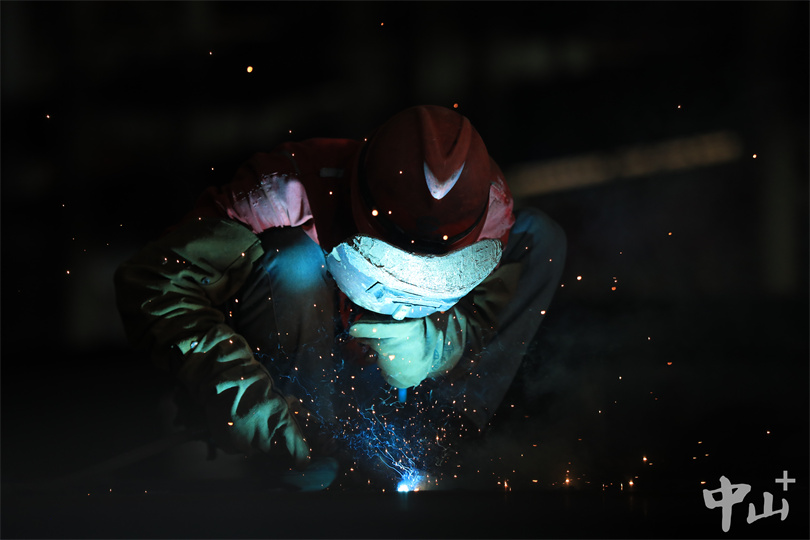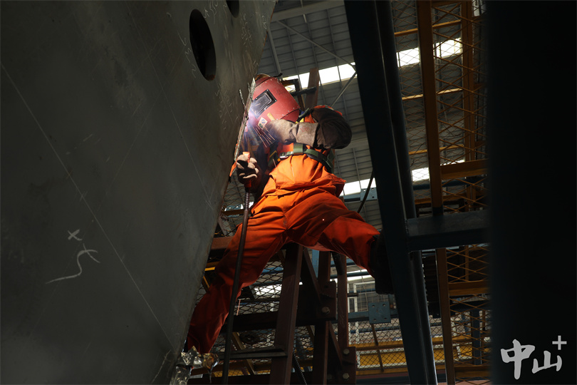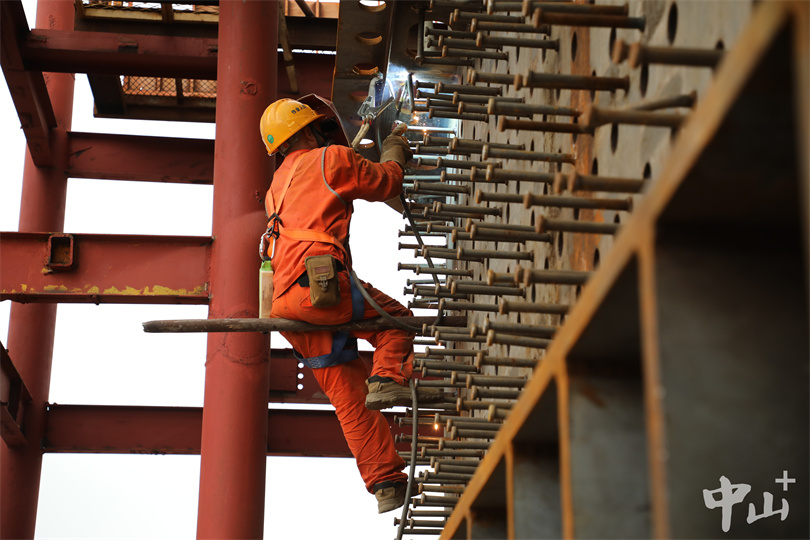 ▲电焊工人在狮子洋通道钢壳塔外立面作业。