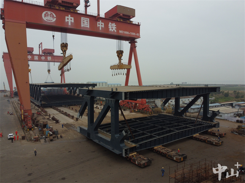 ▲中铁南方工程装备有限公司厂内正在进行香山大桥大节段转运作业。