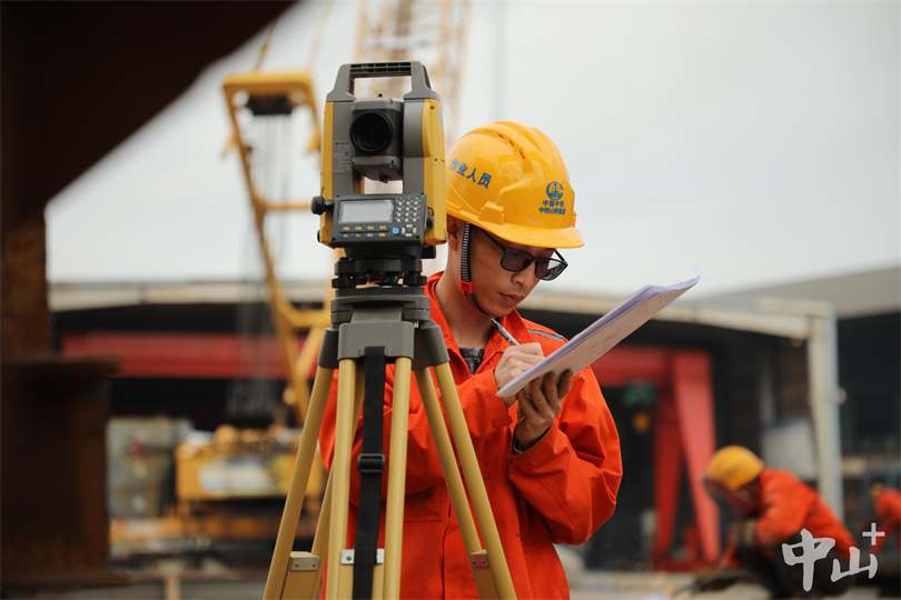 ▲工人用全站仪对建设中的厦门三通道钢壳塔进行测绘。