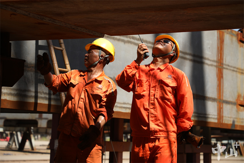 ▲调度工人正在指挥洪奇沥大桥杆件吊装。