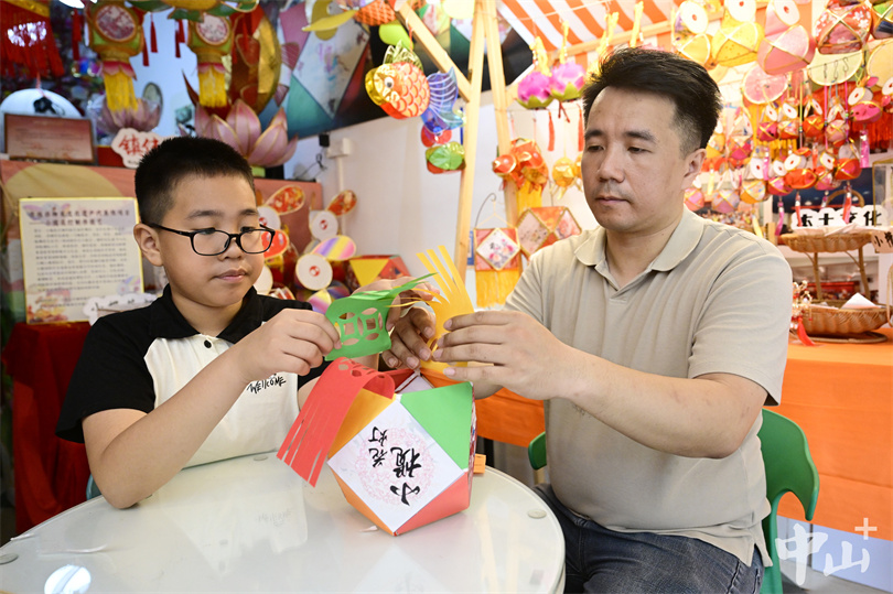 只要不是在上学期间,夫妇俩都会带着儿子去参与花灯制作的展示活动,何梓豪会协助父亲分发材料、给小朋友示范简单步骤。