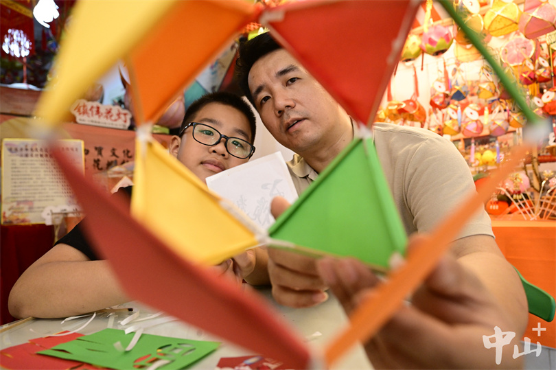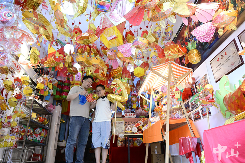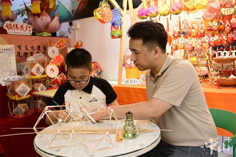 ▲何鸿辉向儿子何梓豪展示制作好的手工花灯。