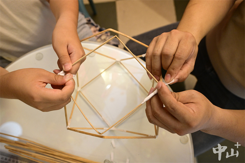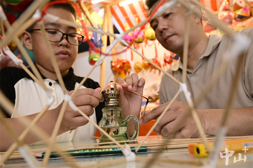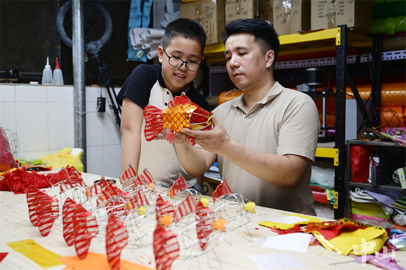 ▲何鸿辉指导儿子何梓豪如何给花灯裱糊,使花灯的形象更加饱满好看。