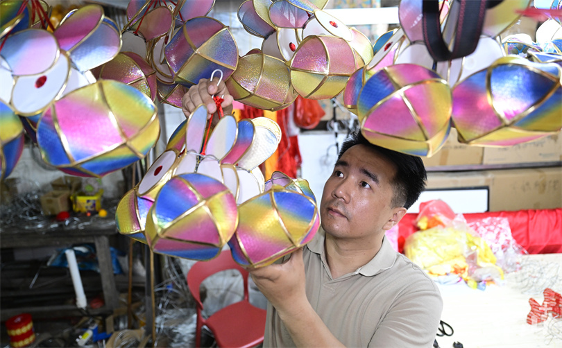 ▲何鸿辉将制作完成的花灯挂好。