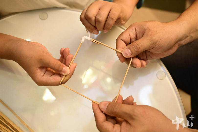 ▲何梓豪在学习折蔑(又叫弯蔑),将竹篾放在火尖上预热,待其软化后按造型需要弯曲定型。