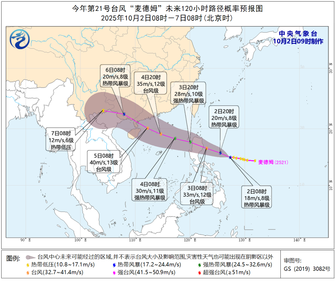 预计“麦德姆”将以20公里左右的时速向西北方向移动,穿过菲律宾吕宋岛后于3日夜间移入南海,强度逐渐加强,5日在粤西到海南岛东部之间的沿海地区登陆。