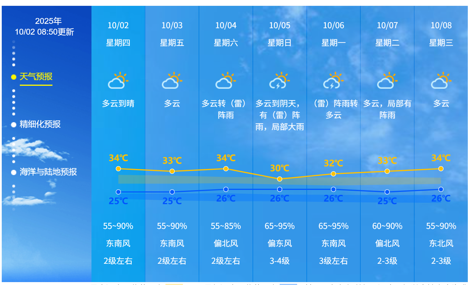 据中山市气象台预测,10月2-3日我市多云到晴,天气较炎热,最高气温34℃;4日多云转(雷)阵雨;5日受台风外围环流影响天气转不稳定,有雷阵雨,局部大雨,伴有6-8级阵风;6日阵雨转多云。