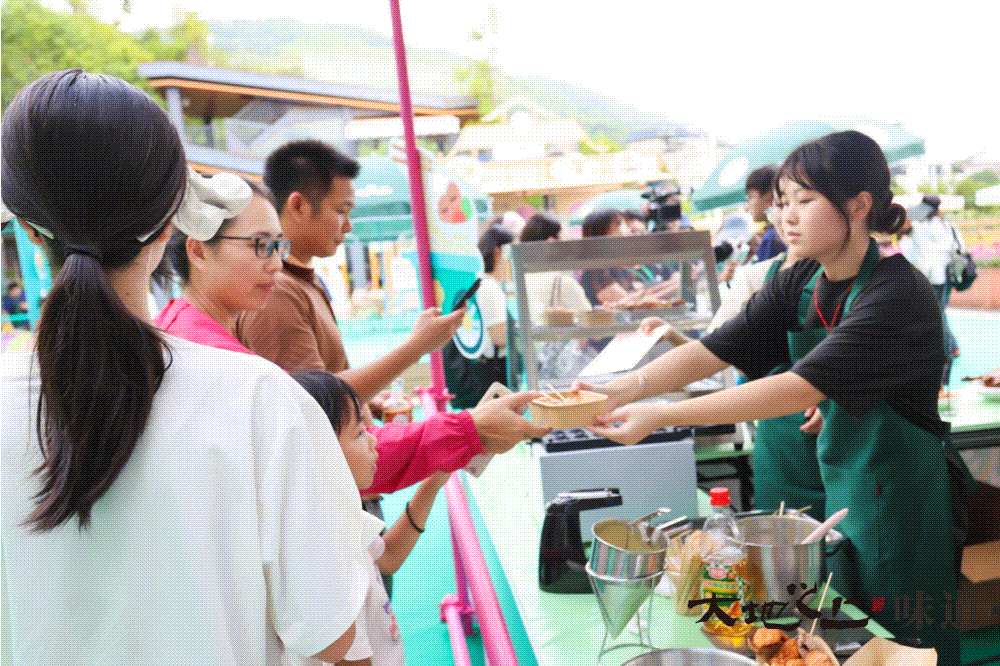 漫步嘉年华现场,11个以城市风味命名的 “湾区融通地标美食馆” 依次映入眼帘——“香味”中山、“品味”深圳、“鲜味”珠海、“滋味”东莞、“趣味”香港、“美味”澳门…… 每个美食馆都展示并展销着对应城市的标志性美食,让游客在田园风光中一站式品味湾区十一城的饮食精华。
