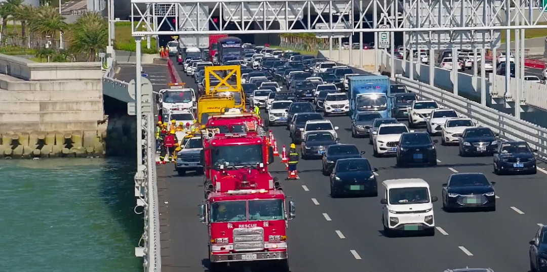10月3日14时09分,深中通道路网调度中心监控员通过事件检测系统,发现一辆粤Q牌小车异常停靠在深圳往中山方向隧道出口处应急车道,车头冒烟,随即窜出明火并快速增大。