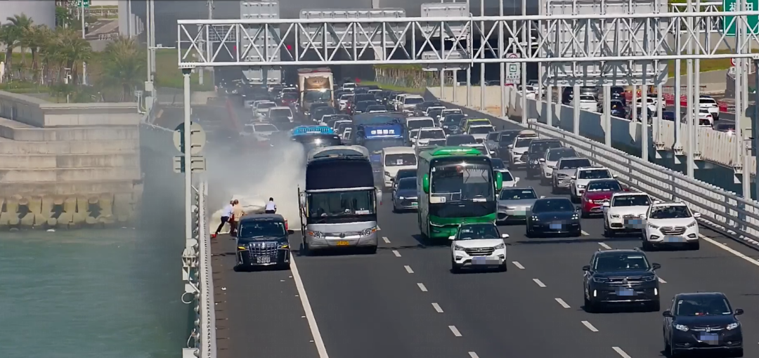 几乎是与此同时,一辆车牌号码为“粤B·97821D”的蓝色大巴车和一辆车牌号码为“粤Z·AG85澳”的黑色七座商务车停靠在侧,两名司机分别从车上、深中通道桥梁外侧护栏上的消防器材箱取下灭火器,与起火车辆驾驶员共同灭火。